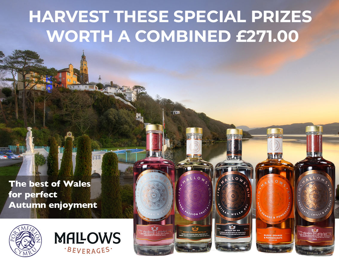 This dual prize provides the best of Wales. For the ultimate visitor experience what could be better than to explore the uniquely beautiful Portmeiron village in September or October. In addition, Wales’s largest drinks company, Mallows Beverages, are contributing a collection of its best-selling gins to complete your enjoyment, as seen in image below. All you have to do to win the main prize or the runner up prize is complete the form below before noon on Tuesday 30th September.